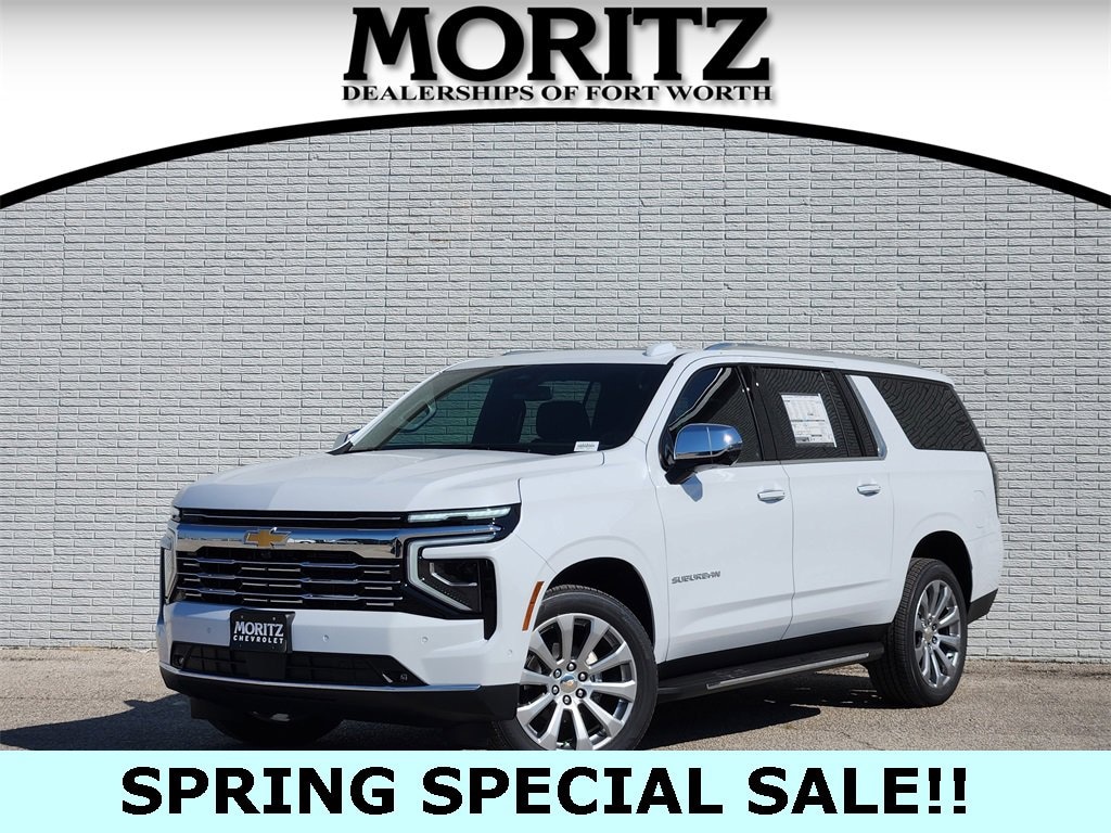 Polar White 2026 Chevrolet Suburban Premier 4WD 10-Speed Automatic with Overdrive EcoTec3 5.3L V8 Bluetooth, Backup Camera, 10 Speakers, 2-Speed Active Electronic AutoTrac Transfer Case, 3rd Row 60/40 Power-Folding Split-Bench, 3rd row seats: split-bench, 4-Way Power Driver Lumbar Seat Adjuster, 4-Way Power Front Passenger Lumbar Seat Adjuster, 8-Way Power Driver Seat Adjuster, 8-Way Power Front Passenger Seat Adjuster, Advanced Trailering Package, AM/FM radio: SiriusXM with 360L, Auto-Dimming Inside Rear-View Mirror, Chrome Mirror Caps, Dual Exhaust System, Dual-Pane Power Panoramic Sunroof, Exterior Parking Camera Rear, Front Bucket Seats, Front Center Armrest, Front dual zone A/C, Front LED Fog Lamps, Heated 2nd Row Outboard Seats, Heated front seats, Heated Power-Adjustable Outside Mirrors, Heated rear seats, Heated Steering Wheel, Hill Descent Control, Integrated Trailer Brake Controller, Interior Camera, LED Tail Lamps, License Plate Front Mounting Package, Max Trailering Package, Memory seat, Memory Settings, Navigation system: Google built-in compatibility (select service plan required, terms and limitations apply), Perforated Leather Seating Surfaces, Power driver seat, Power Liftgate, Power passenger seat, Power Release 2nd Row Bucket Seats, Power steering, Power windows, Power-Sliding Center Floor Console, Preferred Equipment Group 1LZ, Radio data system, Radio: 17.7 Diagonal Advanced Color LCD Display, Rear air conditioning, Rear Power Liftgate, Rear window defroster, Remote keyless entry, Smart Trailer Integration Indicator, Split folding rear seat, Steering wheel memory, Steering wheel mounted audio controls, Turn signal indicator mirrors, Universal Home Remote, Ventilated front seats, Wireless Apple CarPlay/Wireless Android Auto, Wireless Phone Charging.
