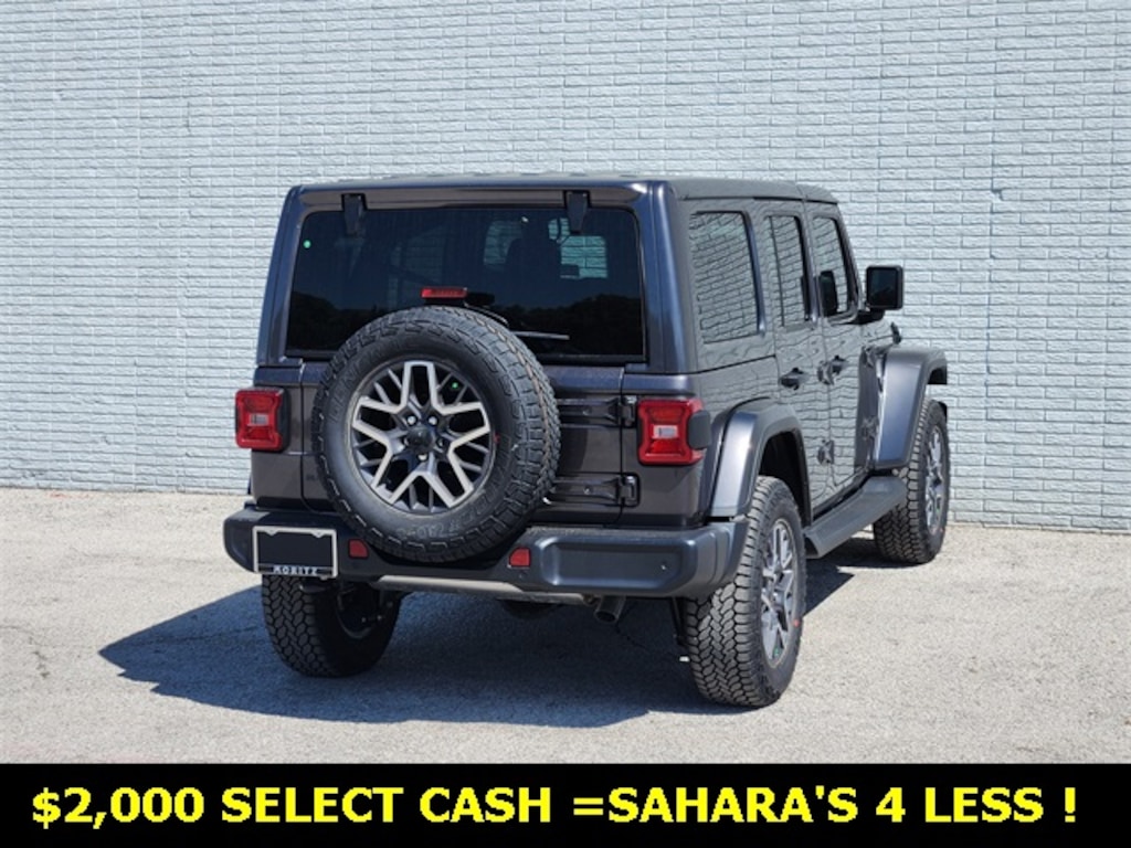 Granite Crystal Metallic Clearcoat 2025 Jeep Wrangler Sahara 4WD 8-Speed Automatic 3.6L V6 24V VVT Bluetooth, Backup Camera, 3.45 Overall Top Gear Ratio, 8 Speakers, Air Conditioning, AM/FM radio: SiriusXM, Apple CarPlay, Apple CarPlay/Android Auto, Auto High Beam Headlamp Control, Automatic temperature control, Blind Spot & Cross Path Detection, Body Color 3-Piece Hard Top, Cloth Low-Back Bucket Seats, Compass, Connectivity - US/Canada, Driver door bin, Driver vanity mirror, Dual front impact airbags, Dual front side impact airbags, Electronic Stability Control, Emergency communication system: Jeep Connect, Freedom Panel Storage Bag, Front Bucket Seats, Front dual zone A/C, Front fog lights, Front reading lights, Fully automatic headlights, Google Android Auto, Heated front seats, Heated steering wheel, Heavy Duty Suspension w/Gas Shocks, Illuminated entry, Integrated Center Stack Radio, Integrated roll-over protection, Low tire pressure warning, Occupant sensing airbag, Outside temperature display, Overhead airbag, Panic alarm, ParkSense Rear Park Assist System, ParkView Rear Back-Up Camera, Passenger door bin, Passenger vanity mirror, Power door mirrors, Power steering, Power windows, Quick Order Package 24G Sahara, Radio data system, Radio: Uconnect 5 w/12.3" Display, Rear anti-roll bar, Rear reading lights, Rear Window Defroster, Rear Window Wiper/Washer, Remote keyless entry, Safety Group, Security system, Side Steps, Speed control, Split folding rear seat, Steering wheel mounted audio controls, Stop-Start Dual Battery System, Telescoping steering wheel, Tilt steering wheel, Traction control, Trip computer, Variably intermittent wipers, Voltmeter, Wheels: 18" x 7.5" Machine/Painted Gray. Prices do not include tax, title and license fees.$2500 - 2025 National Retail Bonus Cash . Exp. 11/03/2025