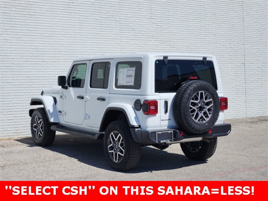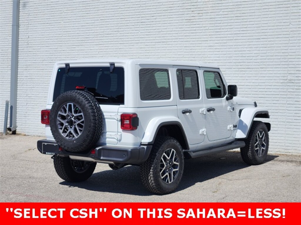 Bright White Clearcoat 2025 Jeep Wrangler Sahara 4WD 8-Speed Automatic 2.0L I4 DOHC Bluetooth, Backup Camera, #1 Seat Foam Cushion, 12.3" Touchscreen Display, 3.45 Overall Top Gear Ratio, 4G LTE Wi-Fi Hot Spot, Alpine Premium Audio System, Apple CarPlay, Auto High Beam Headlamp Control, Auto-Dimming Rear-View Mirror, Automatic temperature control, Blind Spot & Cross Path Detection, Connected Travel & Traffic Services, Connectivity - US/Canada, Delay-off headlights, Disassociated Touchscreen Display, For More Info, Call 800-643-2112, Front Center Armrest w/Storage, Front dual zone A/C, Front fog lights, Google Android Auto, GPS Navigation, Hard Seat Back, HD Radio, Heavy Duty Suspension w/Gas Shocks, Integrated Center Stack Radio, Integrated Off-Road Camera, Integrated Voice Command w/Bluetooth, Leather Wrapped Park Brake Handle, Leather Wrapped Shift Knob, McKinley Trimmed Seats, ParkSense Rear Park Assist System, ParkView Rear Back-Up Camera, Power 4-Way Driver Lumbar Adjust, Power 4-Way Passenger Lumbar Adjust, Power Adjust 8-Way Driver Seat, Power Adjust 8-Way Front Passenger Seat, Power steering, Power windows, Quick Order Package 22G Sahara, Radio: Uconnect 5 Nav w/12.3" Display, Remote keyless entry, Sahara Popular Equipment Group, Security system, Side Steps, SiriusXM Radio Service, SiriusXM w/360L, Speed control, Steering wheel mounted audio controls, Stop-Start Dual Battery System, Traction control, Universal Garage Door Opener, Variably intermittent wipers, Wheels: 18" x 7.5" Machine/Painted Gray. Prices do not include tax, title and license fees.$1500 - 2025 National Bonus Cash . Exp. 02/02/2026 $2000 - 2025 National Select Inventory Bonus Cash w/ 3FV . Exp. 02/02/2026 $2500 - 2025 National Retail Bonus Cash . Exp. 02/02/2026