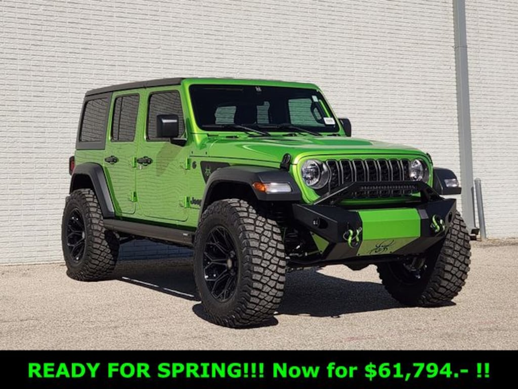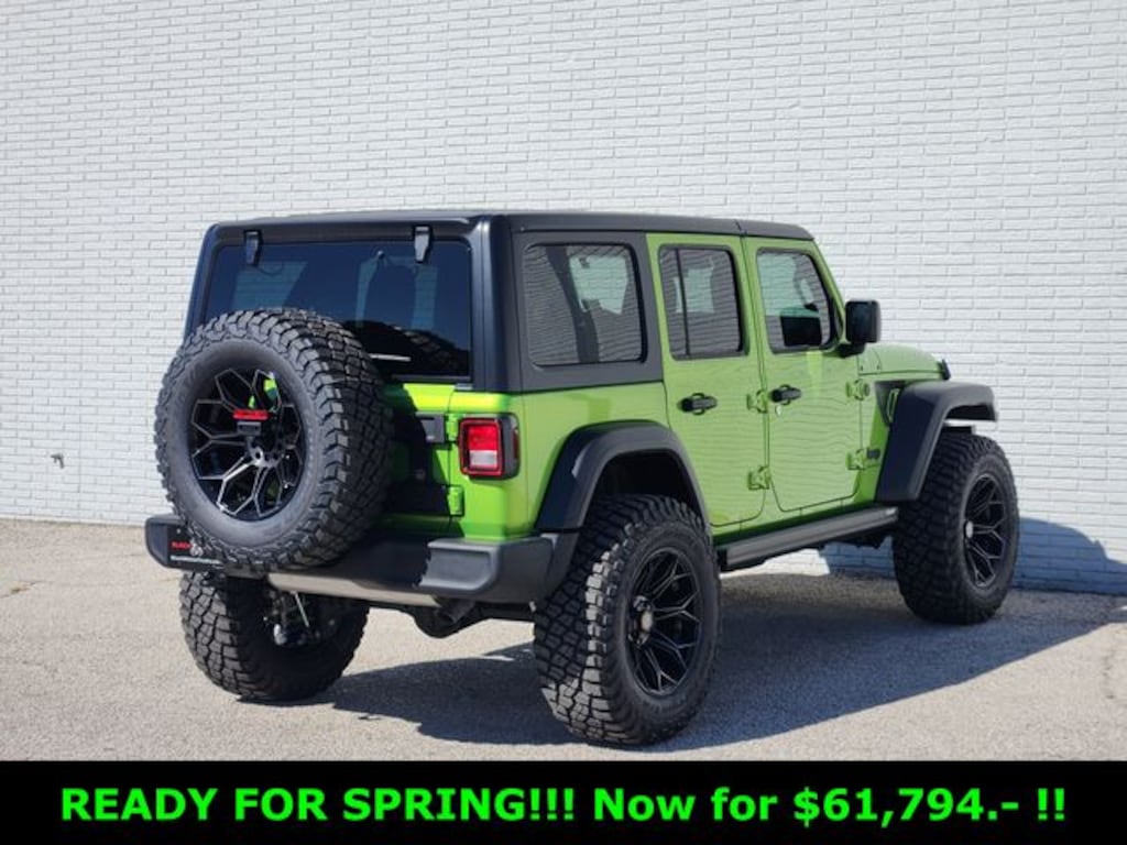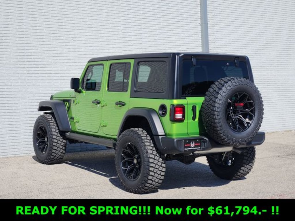 3 inch Suspension Lift System Fox Adventure Series Shocks 20 inch Black Off Road Wheels (Exch) 37 inch Premium All Terrain Tires (Exch) Mopar Speedo Calibration and Whipple Transmission Calibration Power Running Boards Stamped Steel Hood Replacement with Vented Inserts Black Widow Custom Stitch Headrests Leather Seat Covers with Custom Stitch Red LED Interior Lighting Premium Sound System by Rockford Fosgate Tinted Front Windows Black Widow Spider on Windshield Fender Spider Decals Black Widow Bumper (Powder Coated) 20 inch LED Light Bar 10,000 lb Winch Accent Paint (Painted Coil Springs/Suspension/D-Rings) Oversized Spare Tire Relocation Bracket Painted Fender Vents Hinge Gate Reinforcement for Oversized Tires 3rd Brake Light Relocation Kit Full Exterior Paint. Mojito Clearcoat 2025 Jeep Wrangler Sport S Rocky Ridge Rocky Ridge 4WD 8-Speed Automatic 3.6L V6 24V VVT 2025 WRANGLER BLACK WIDOW, 2-Door Passive Entry, Front Door Locks, 4-Wheel Disc Brakes, 8 Speakers, ABS brakes, Advanced Brake Assist, Air Conditioning, Air Conditioning w/Auto Temperature Control, Air Filtering, AM/FM radio: SiriusXM, Automatic Headlamps, Cloth Low-Back Bucket Seats, Cluster 7.0" TFT Color Display, Compass, Convenience Group, Corning Gorilla Glass, Deep Tint Sunscreen Windows, Delay-off headlights, Driver door bin, Driver vanity mirror, Dual front impact airbags, Electronic Stability Control, Emergency/Assistance Call, Enhanced Adaptive Cruise Control, Front anti-roll bar, Front Bucket Seats, Front Center Armrest w/Storage, Front fog lights, Full Speed Forward Collision Warning Plus, Heated Front Seats, Heated Steering Wheel, Illuminated entry, Integrated roll-over protection, Low tire pressure warning, Normal Duty Suspension, Occupant sensing airbag, Outside temperature display, Overhead airbag, Panic alarm, ParkView Rear Back-Up Camera, Passenger door bin, Passenger vanity mirror, Power Heated Mirrors, Power steering, Power windows, Premium Wrapped Steering Wheel, Quick Order Package 24S Sport S, Radio data system, Radio: Uconnect 5 w/12.3" Display, Rear reading lights, Remote keyless entry, Remote Start System, Security Alarm, Steering wheel mounted audio controls, Stop-Start Dual Battery System, Sun Visors w/Illuminated Vanity Mirrors, Tachometer, Telescoping steering wheel, Traction control, Trip computer, Universal Garage Door Opener, Variably intermittent wipers, Wheels: 17" x 7.5" Gray. Price includes dealer added accessories.