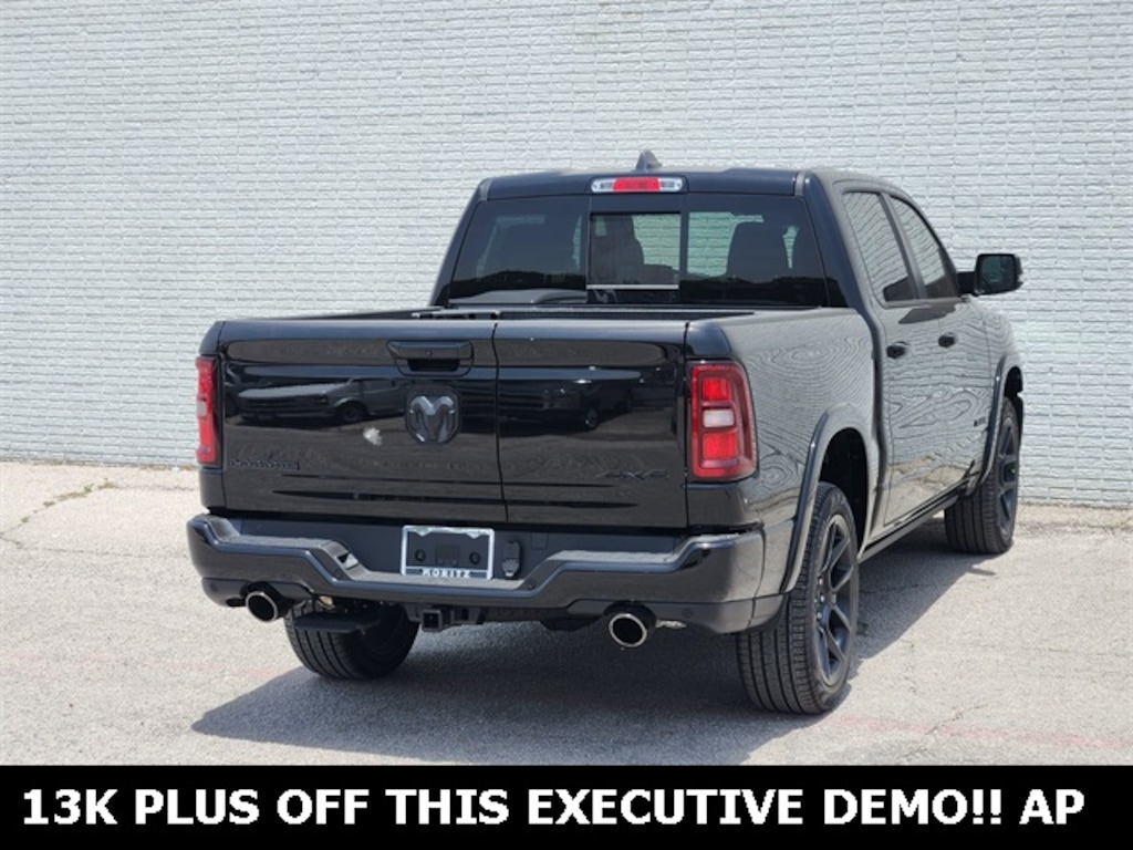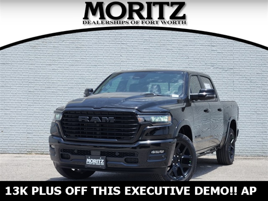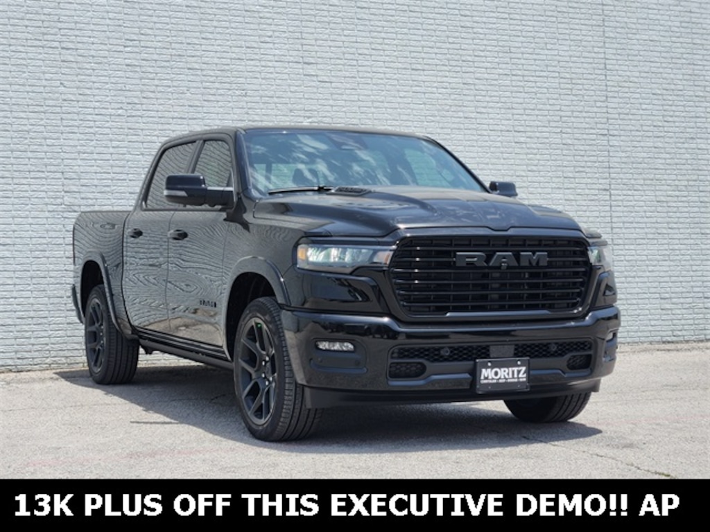 Diamond Black Crystal Pearlcoat 2025 Ram 1500 Laramie DEMO 4WD 8-Speed Automatic 3.0L I6 Bluetooth, Backup Camera, #1 Seat Foam Cushion, 10 Speakers, 14.4" Touchscreen Display, 3 Rear Seat Head Restraints, 3.92 Rear Axle Ratio, 33 Gallon Fuel Tank, 4 Way Front Headrests, 4-Wheel Disc Brakes, 4G LTE Wi-Fi Hot Spot, ABS brakes, Accent Color Door Handles, Accent Color Premium Power Mirrors, Accent Color Tailgate Handle, Air Conditioning, Anti-Spin Differential Rear Axle, Apple CarPlay, Apple CarPlay/Android Auto, Audio memory, Auto High-beam Headlights, Auto Power-Folding Mirrors, Auto-Dimming Exterior Driver Mirror, Automatic temperature control, Bed Utility Group, Black Exterior Truck Badging, Black Headlamp Bezels, Black Interior Accents, Black Painted Exterior Mirrors Caps, Black Tail Lamp Bezels, Body Color Front Bumper, Body Color Rear Bumper w/Step Pads, Bucket Seats, Center Console Parts Module, Cluster 12" TFT Color Display, Connected Travel & Traffic Services, Connectivity - US/Canada, Convex Wide-Angle Exterior Mirror Insert, Delay-off headlights, Dome Dual LED Reading Lamp, Driver Seat Memory, Driver vanity mirror, Dual Exhaust w/Black Tips, Dual front side impact airbags, Exterior Mirrors Approach Lamps, Exterior Mirrors Courtesy Lamps, Exterior Mirrors w/Heating Element, Exterior Mirrors w/Memory, Exterior Mirrors w/Supplemental Signals, Front Seat Back Map Pockets, Front wheel independent suspension, Full Length Upgraded Floor Console, Fully automatic headlights, Google Android Auto, GPS Antenna Input, GPS Navigation, Grille Surround 3 Black Texture 2 Black, harman/kardon 19 Speaker Premium Sound, HD Radio, Heated Front Seats, Heated front seats, Heated rear seats, Heated Second Row Seats, Heated Steering Wheel, Integrated Voice Command w/Bluetooth, Laramie Level 2 Equipment Group, Leather Trimmed Bucket Seats, LED Dome/Reading Lamp, MOPAR 4 Adjustable Cargo Tie-Down Hooks, MOPAR Spray In Bedliner, Navigation System, Night Edition, Occupant sensing airbag, Outside temperature display, Overhead airbag, Overhead console, Panic alarm, Pirelli Brand Tires, Power 2-Way Driver Lumbar Adjust, Power 2-Way Passenger Lumbar Adjust, Power Adjust 8-Way Driver Seat, Power Adjust 8-Way Front Passenger Seat, Power driver seat, Power steering, Power Tailgate, Proximity Approach/Departure Lamps, Quick Order Package 21H Laramie, Radio: Uconnect 5 Nav w/14.4" Display, Rain Sensitive Windshield Wipers, RAM Grille Badge - Black, Rear 60/40 Folding Split Recline Seat, Rear reading lights, Rear seat center armrest, Remote keyless entry, Security system, SiriusXM w/360L, Sport Performance Hood, Steering wheel mounted audio controls, USB Host Flip, Variably intermittent wipers, Ventilated Front Seats, Wheels: 22" x 9" Forged Aluminum.