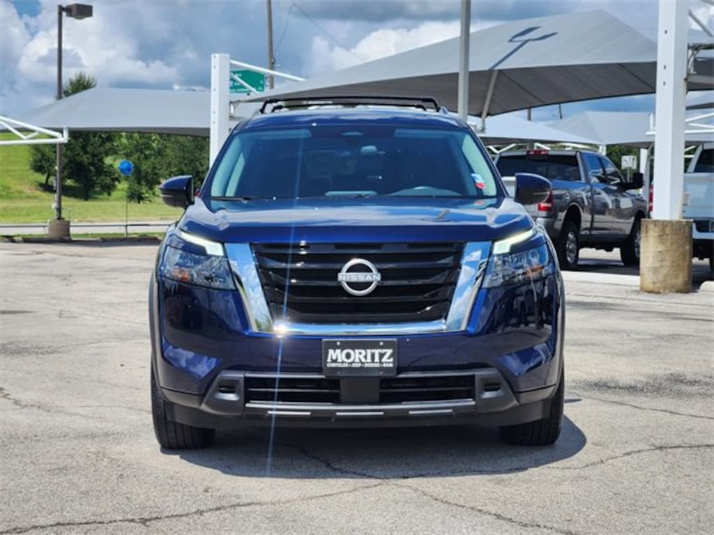 Deep Ocean Blue Pearl 2023 Nissan Pathfinder SV FWD 9-Speed Automatic V6 Bluetooth, Backup Camera, The Moritz Promise LIMITED LIFETIME POWERTRAIN PROTECTION PLAN See dealer for details, 3rd row seats: bench, Alloy wheels, Auto High-beam Headlights, Automatic temperature control, Brake assist, Cross Bars, Electronic Stability Control, Four wheel independent suspension, Front Bucket Seats, Fully automatic headlights, Heated Front Bucket Seats, Illuminated entry, NissanConnect featuring Apple CarPlay and Android Auto, Power driver seat, Rear air conditioning, Rear Parking Sensors, Reclining 3rd row seat, Security system, Speed-sensing steering, Spoiler, Steering wheel mounted audio controls, Telescoping steering wheel, Traction control.